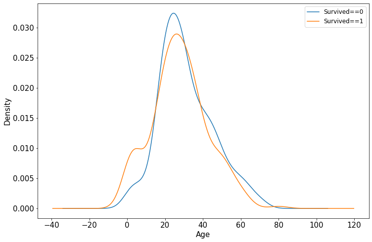 ax.legend(['Survived==0','Survived==1'],fontsize = 12) # 图例