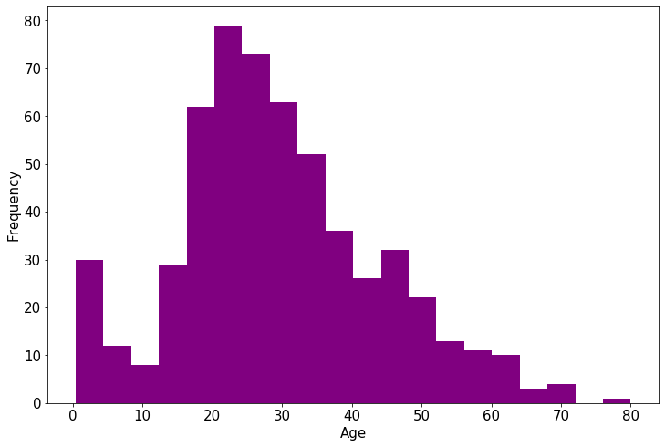 ax = dftrain_raw['Age'].plot(kind = 'hist',bins = 20,color= 'purple',